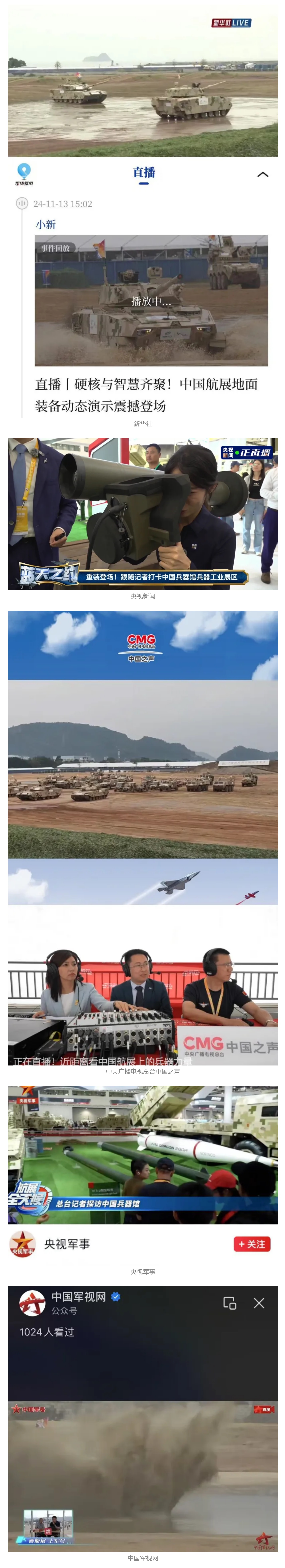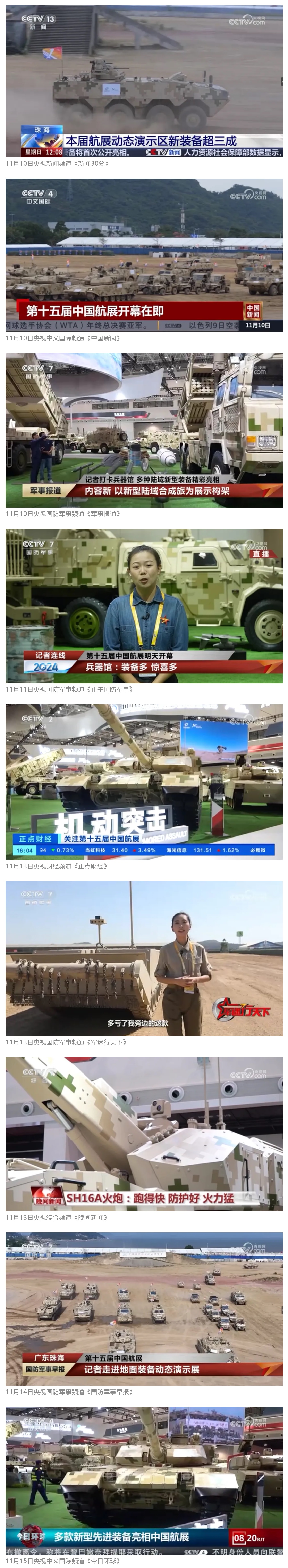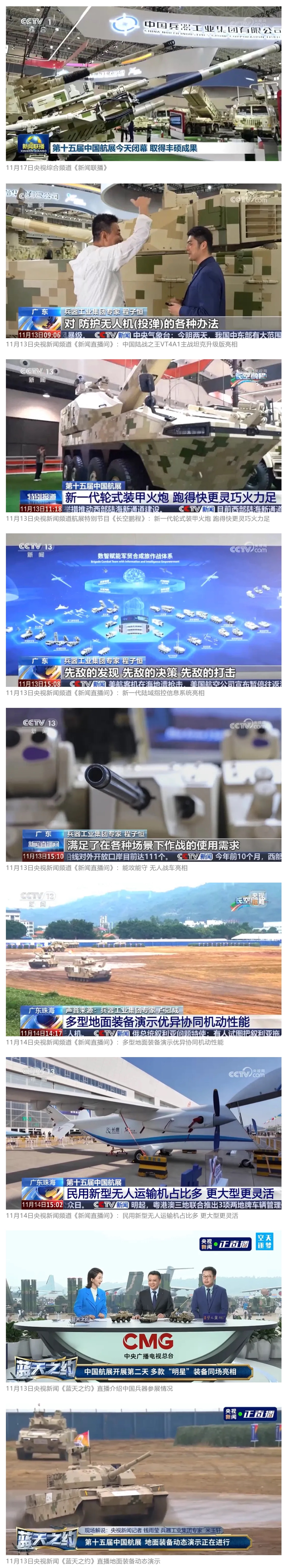 11月13日央视新闻《蓝天之约》直播地面装备动态演示此次航展,央视综合频道《新闻联播》《晚间新闻》、新闻频道《新闻直播间》《新闻30分》《朝闻天下》《共同关注》《东方时空》《午夜新闻》、财经频道《天下财经》《经济信息联播》《正点财经》《第一时间》、中文国际频道《今日环球》《中国新闻》、国防军事频道《军事报道》《正午国防军事》《国防军事早报》《军迷行天下》等栏目共播出兵器工业集团参展相关新闻报道40余条。11月10日央视新闻频道《新闻30分》11月10日央视中文国际频道《中国新闻》11月10日央视国防军事频道《军事报道》11月11日央视国防军事频道《正午国防军事》