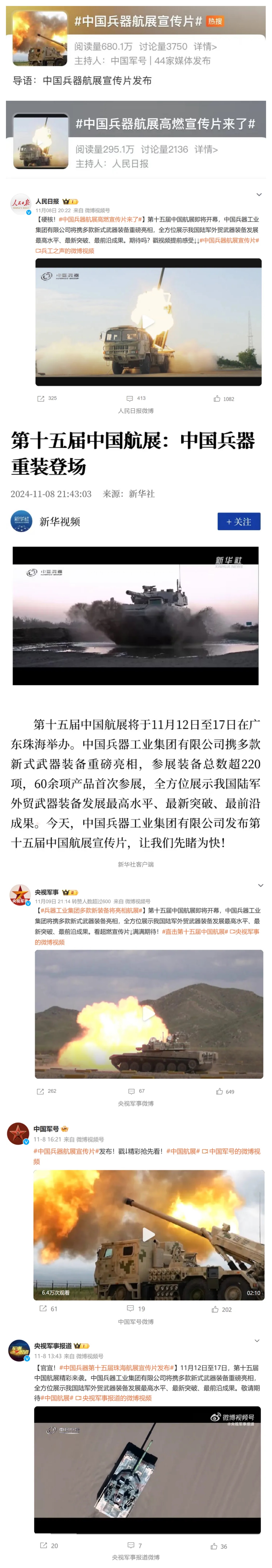 人民日报微博、新华社客户端、央视军事微博、中国军号微博、央视军事报道微博、中国日报微博、中国新闻网、中国青年报-青蜂侠、环球网、环球时报(脸书、X平台)、学习强国中央企业学习平台、共青团中央微博、国资委网站等20余家中央主流媒体、国家部委的新媒体第一时间播发集团公司航展宣传片等视频作品燃爆全网,累计阅读量突破1200万人次。集团公司微信公众号、微博、抖音号、快手号、微信视频号、知乎号等新媒体宣传片播放阅读量近1000万人次,点赞近20万人次。