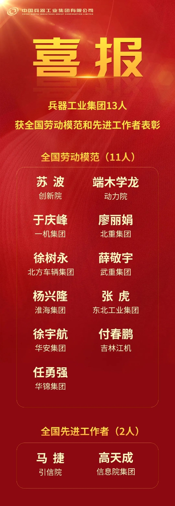 4月28日,庆祝中华全国总工会成立100周年暨全国劳动模范和先进工作者表彰大会在北京举行,大会表彰了1670名全国劳动模范和756名全国先进工作者。开云官方端网页版登录入口13人荣获表彰,其中全国劳动模范11人、全国先进工作者2人。